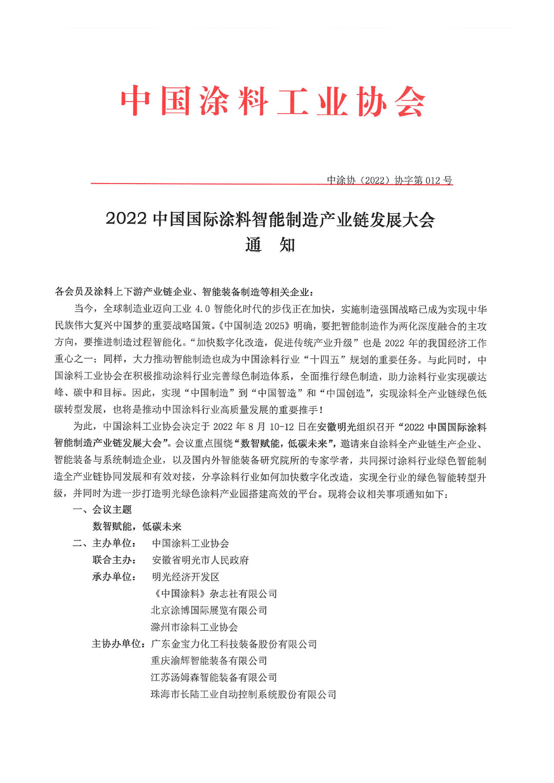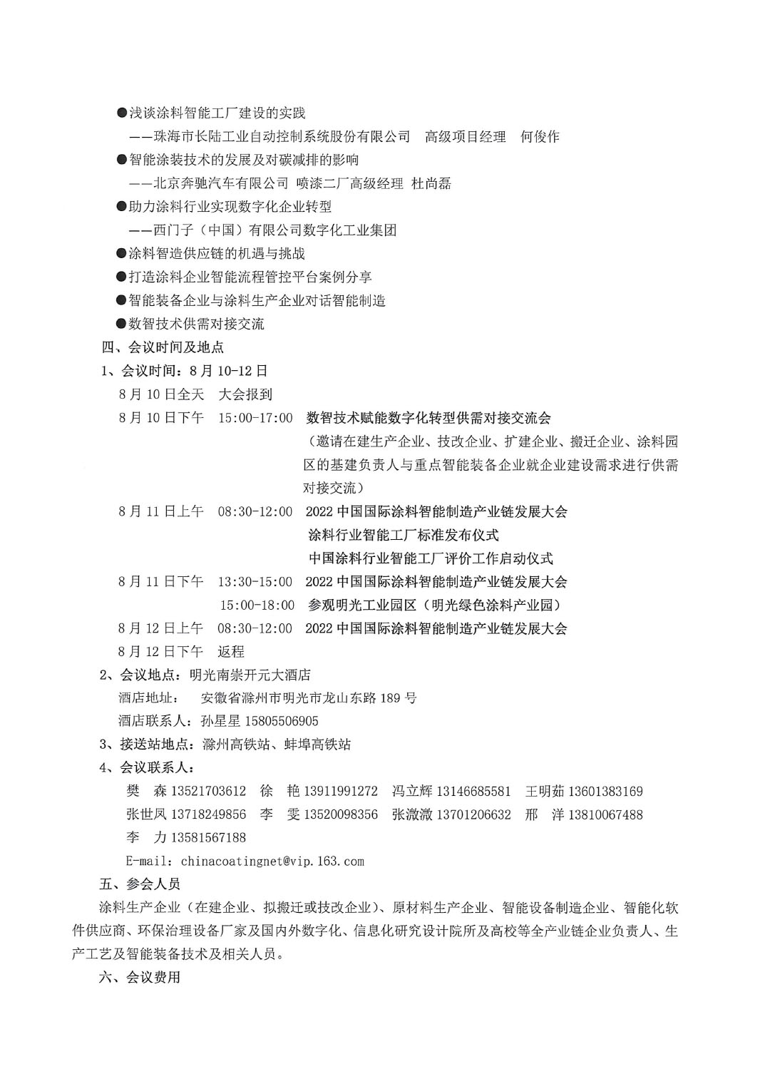 为此,best365中国官方网站决定于2022年8月10-12日在安徽明光组织召开“2022中国国际涂料智能制造产业链发展大会”。会议重点围绕“数智赋能,低碳未来”,邀请来自涂料全产业链生产企业、智能装备与系统制造企业,以及国内外智能装备研究院所的专家学者,共同探讨涂料行业绿色智能制造全产业链协同发展和有效对接,分享涂料行业如何加快数字化改造,实现全行业的绿色智能转型升级,并同时为进一步打造明光绿色涂料产业园搭建高效的平台。现将会议相关事项通知如下: