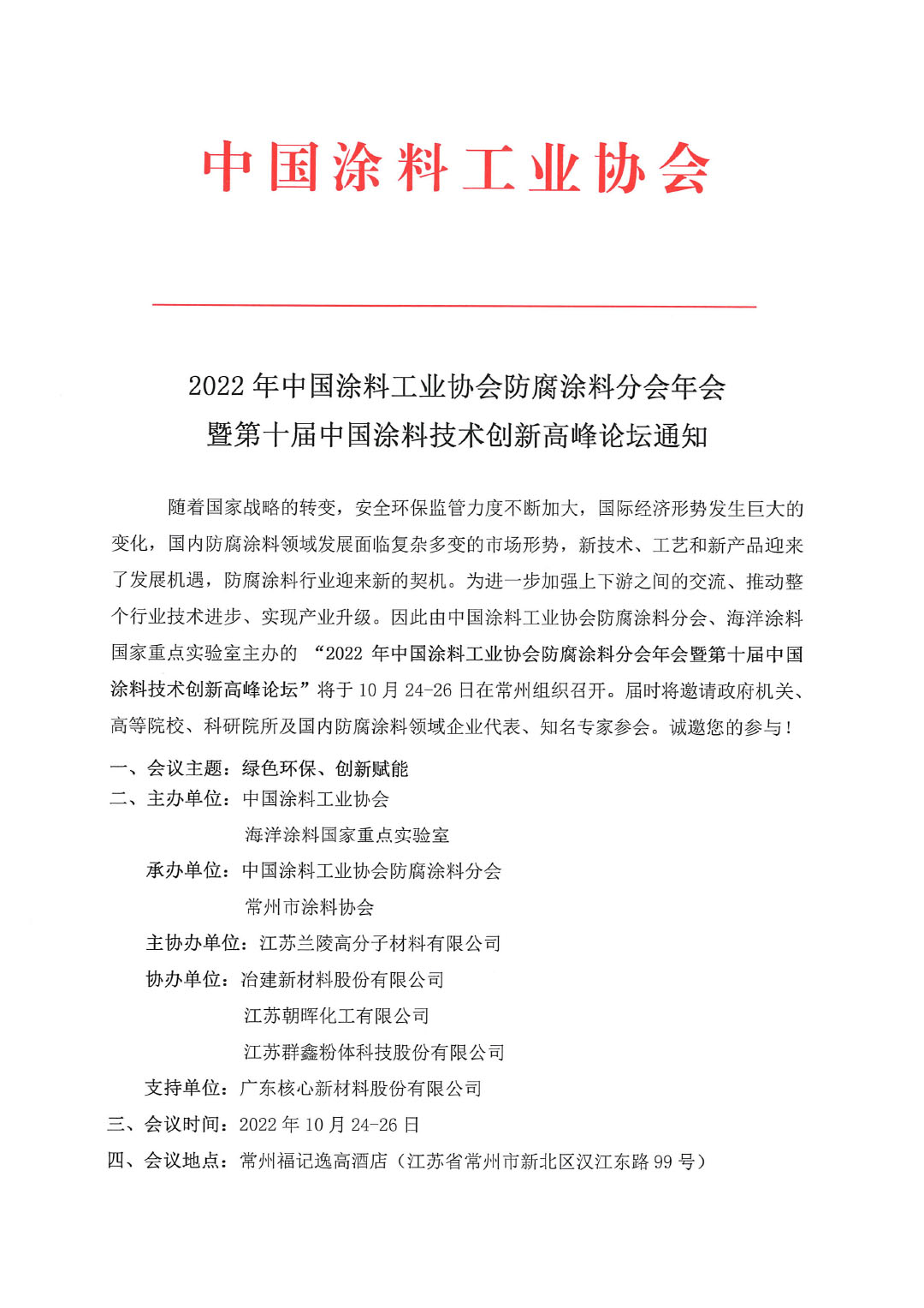 随着国家战略的转变,安全环保监管力度不断加大,国际经济形势发生巨大的变化,国内防腐涂料领域发展面临复杂多变的市场形势,新技术、工艺和新产品迎来了发展机遇,防腐涂料行业迎来新的契机。为进一步加强上下游之间的交流、推动整个行业技术进步、实现产业升级。因此由best365中国官方网站防腐涂料分会、海洋涂料国家重点实验室主办的 “2022年best365中国官方网站防腐涂料分会年会暨第十届中国涂料技术创新高峰论坛”将于10月24-26日在常州组织召开。届时将邀请政府机关、高等院校、科研院所及国内防腐涂料领域企业代表、知名专家参会。诚邀您的参与!