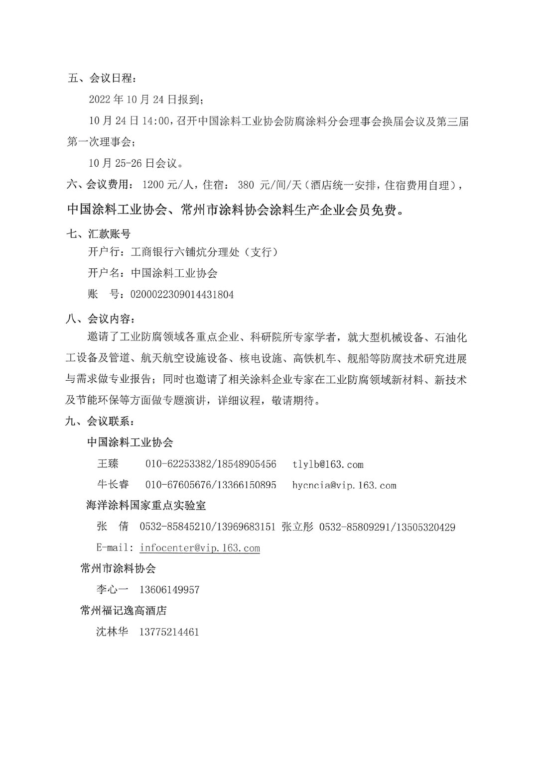 六、会议费用: 1200元/人,住宿: 380 元/间/天(酒店统一安排,住宿费用自理),best365中国官方网站、常州市涂料协会涂料生产企业会员免费。