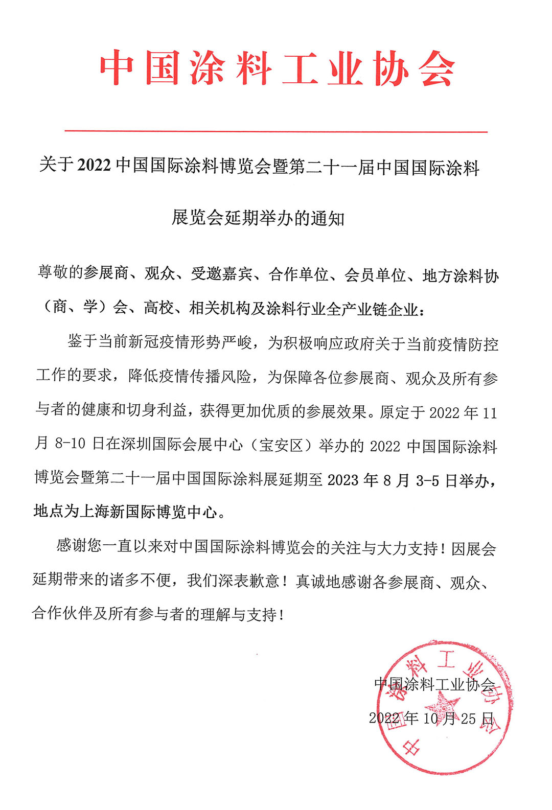 鉴于当前新冠疫情形势严峻,为积极响应政府关于当前疫情防控工作的要求,降低疫情传播风险,为保障各位参展商、观众及所有参与者的健康和切身利益,获得更加优质的参展效果。原定于2022年11月8-10日在深圳国际会展中心(宝安区)举办的2022中国国际涂料博览会暨第二十一届中国国际涂料展延期至2023年8月3-5日举办,地点为上海新国际博览中心。
