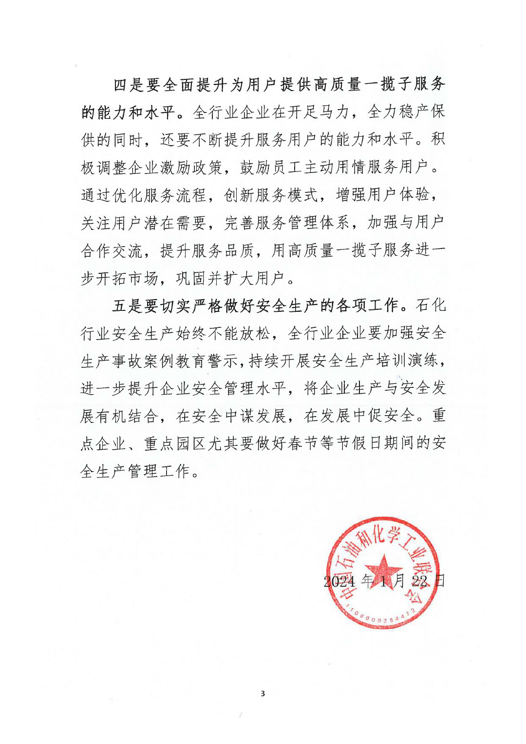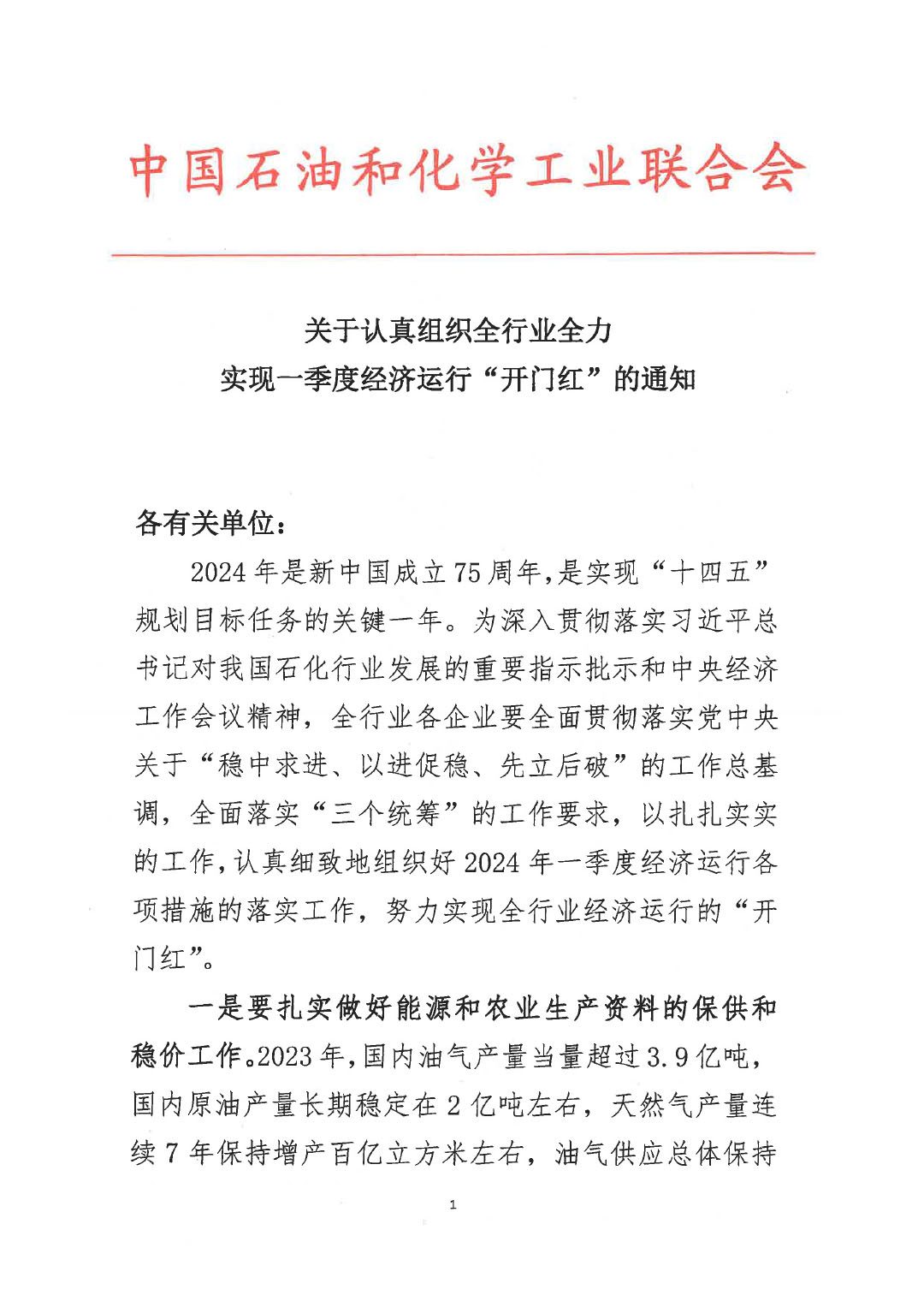 2024年是新中国成立75周年,是实现“十四五”规划目标任务的关键一年。为深入贯彻落实习近平总书记对我国石化行业发展的重要指示批示和中央经济工作会议精神,全行业各企业要全面贯彻落实党中央关于“稳中求进、以进促稳、先立后破”的工作总基调,全面落实“三个统筹”的工作要求,以扎扎实实的工作,认真细致地组织好2024年一季度经济运行各项措施的落实工作,努力实现全行业经济运行的“开门红”。