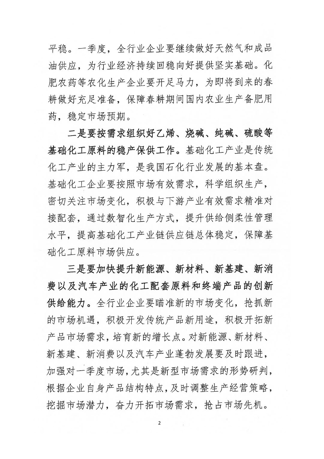 三是要加快提升新能源、新材料、新基建、新消费以及汽车产业的化工配套原料和终端产品的创新供给能力。全行业企业要瞄准新的市场变化,抢抓新的市场机遇,积极开发传统产品新用途,积极开拓新产品市场需求,培育新的增长点。对新能源、新材料、新基建、新消费以及汽车产业蓬勃发展要及时跟进,加强对一季度市场,尤其是新型市场需求的形势研判,根据企业自身产品结构特点,及时调整生产经营策略,挖掘市场潜力,奋力开拓市场需求,抢占市场先机。