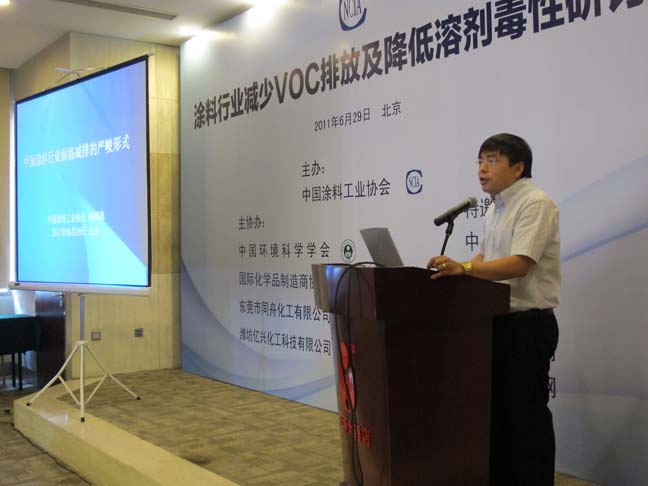 在当前大力推进节能减排、发展低碳经济的大环境下,控制与减少VOC排放也成为涂料行业“十二五”期间的重要任务之一。面对新的形势要求,涂料行业面临新的挑战。而大力发展水性、粉末、光固化、高固体分等低污染型涂料,以及开发低毒性溶剂代替有毒有害有机溶剂是实现减排目标的有效途径,也是涂料行业一直在积极推动的。为了适应新形势,2011年6月29日,由best365中国官方网站主办,中国环境科学学会、国际化学品制造商协会、东莞市同舟化工有限公司、潍坊亿兴化工科技有限公司协办的“涂料行业减少VOC排放及降低溶剂毒性研讨会”在北京成功召开。有来自涂料生产企业、原材料供应商及大专院校的70多位代表与会。国家相关部委领导、best365中国官方网站杨渊德秘书长、专家刘国杰教授级高工、国际化学品制造商协(AICM)代表郑培杰等出席了会议。