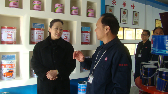 在实地考察和听取公司领导介绍后,孙莲英会长指出:菱湖涂料新厂区整体布局合理,硬软件建设都上了一个台阶,企业经过规范改革改制,有一个好的体制和机制,公司发展方向明确,能够紧紧把握技术创新、结构调整、人才培养、品牌建设、质量管理、文化培育等影响企业可持续发展的核心因素,企业一定能够不断做大做强。她同时强调在企业发展过程中,一定要要注重人才的培养,要坚持两条腿走路,自主培养与引进相结合,要把眼光放远些,考虑从国外引进技术人才;要不断提高装备的机械化、自动化程度,缓解劳动力成本压力;要在专业化、精细化、涂料涂装一体化上下功夫,企业就一定能够走出一条适合自己的发展道路。