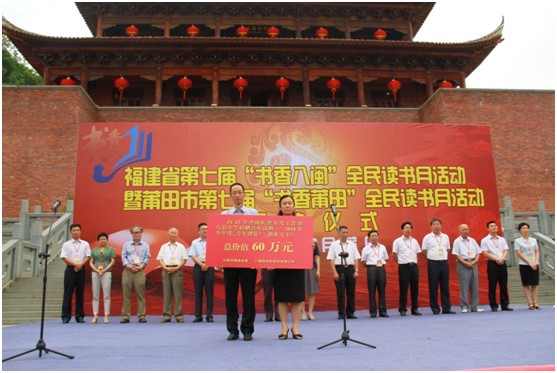 9月28日下午,福建第七届“书香八闽”全民读书月活动在莆田市妈祖研究院举行启动仪式,省人大常委会副主任刘群英、省政协副主席郭振家等领导出席了启动仪式。启动仪式上,三棵树涂料股份有限公司向23个省级扶贫开发重点县中学捐赠《青年博览》等总价值60万元的青年读物,副总裁徐荔芳作为爱心企业代表上台发言。