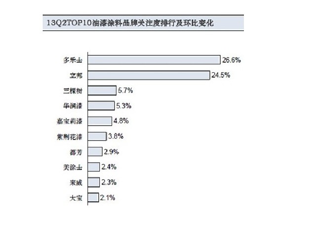 据2013年第二季度TOP10油漆涂料品牌关注度排行及环比变化数据显示,立邦、多乐士仍然以绝对优势占据本季度关注度排行前两位。三棵树总排名位列三强,位居民族涂料品牌关注度首位。
