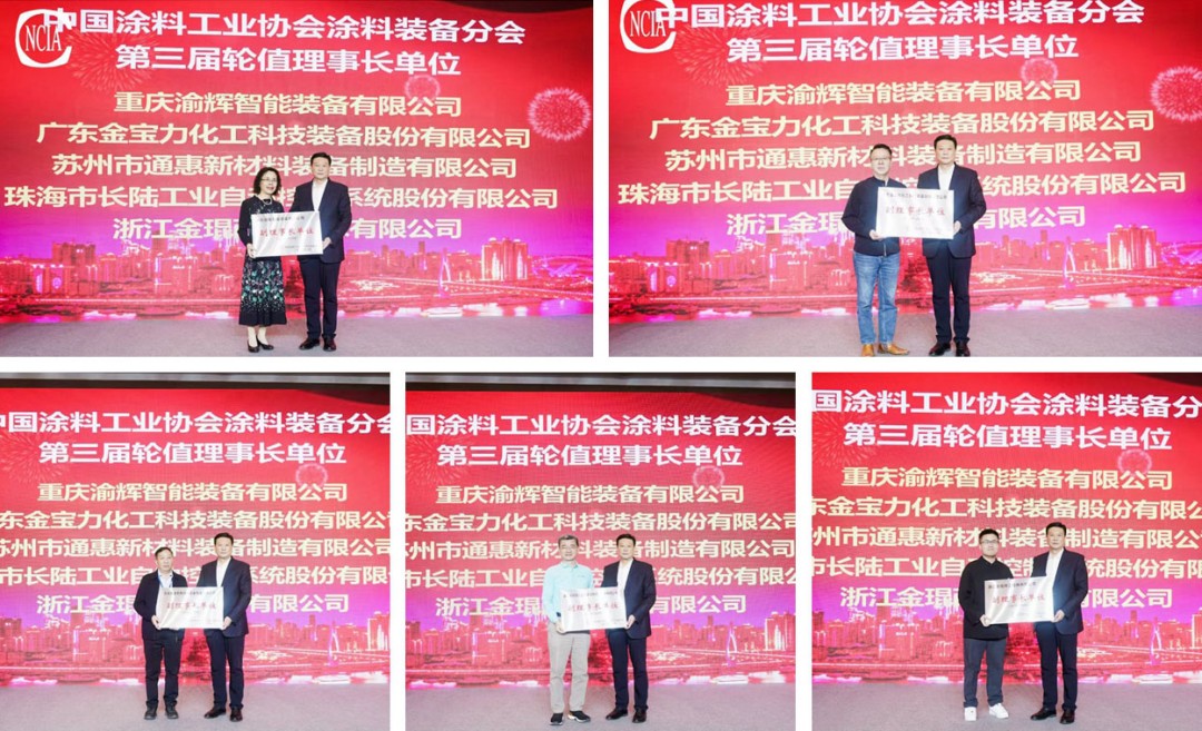会中,刘普军会长为best365中国官方网站涂料装备分会第三届理事会理事长单位江苏长江涂料有限公司,副理事长单位重庆渝辉智能装备有限公司、广东金宝力化工科技装备股份有限公司、苏州市通惠新材料装备制造有限公司、珠海市长陆工业自动控制系统股份有限公司、浙江金琨西立锆珠有限公司授牌,张卫中理事长为理事单位授牌。刘普军会长、张卫中理事长为首任轮值理事长单位重庆渝辉智能装备有限公司授旗。