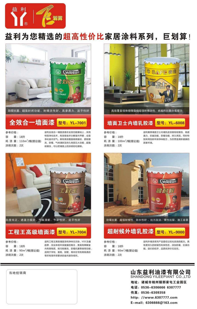 组合内容:全效合一内墙漆(YL-7001)+ 墙面卫士内墙漆(YL-6008)+ 工程王高级内墙漆(YL-7004)+ 超耐候外墙漆(YL-9000)