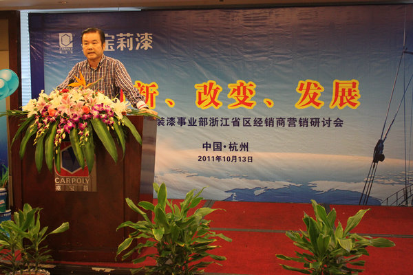 杭州嘉宝莉经销商、浙江日丰公司总经理周金鹏以东道主身份致开幕词,并就杭州的防水工程案例作了分享,表示将紧跟厂家步伐,把杭州嘉宝莉推上一个新台阶。