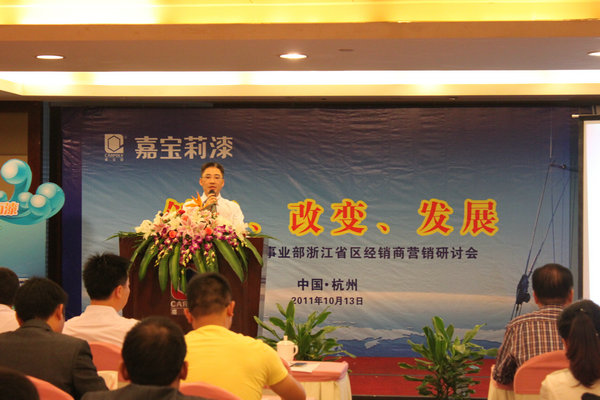 家装漆事业部总经理廖德舞在研讨会上作主题为“Hold住未来”的精彩演讲。他提出了未来家装漆事业部的规划蓝图,并针对如何“Hold住未来”提出了五点要求:加强对团队的深度培训,人才是营销的第一资本;会员的精细化管理,是嘉宝莉长远发展的基础;合理的产品规划建设,使产品利润最大化;渠道精耕细作,是抢占市场的利器;不断的市场投入,进一步提升嘉宝莉品牌的形象和销售力。面对新的市场竞争形势,廖总建议大家用归零的心态和吃苦耐劳的精神,紧跟厂家思路,与时俱进,达成和谐共赢。廖总精彩的演讲,赢得阵阵雷鸣般的掌声。
