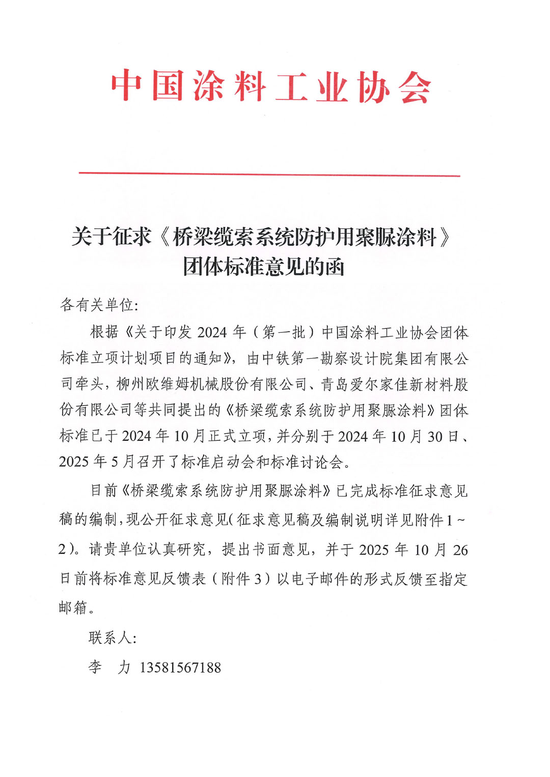 根据《关于印发2024年(第一批)best365中国官方网站团体标准立项计划项目的通知》,由中铁第一勘察设计院集团有限公司牵头,柳州欧维姆机械股份有限公司、青岛爱尔家佳新材料股份有限公司等共同提出的《桥梁缆索系统防护用聚脲涂料》团体标准已于2024年10月正式立项,并分别于2024年10月30日、2025年5月召开了标准启动会和标准讨论会。