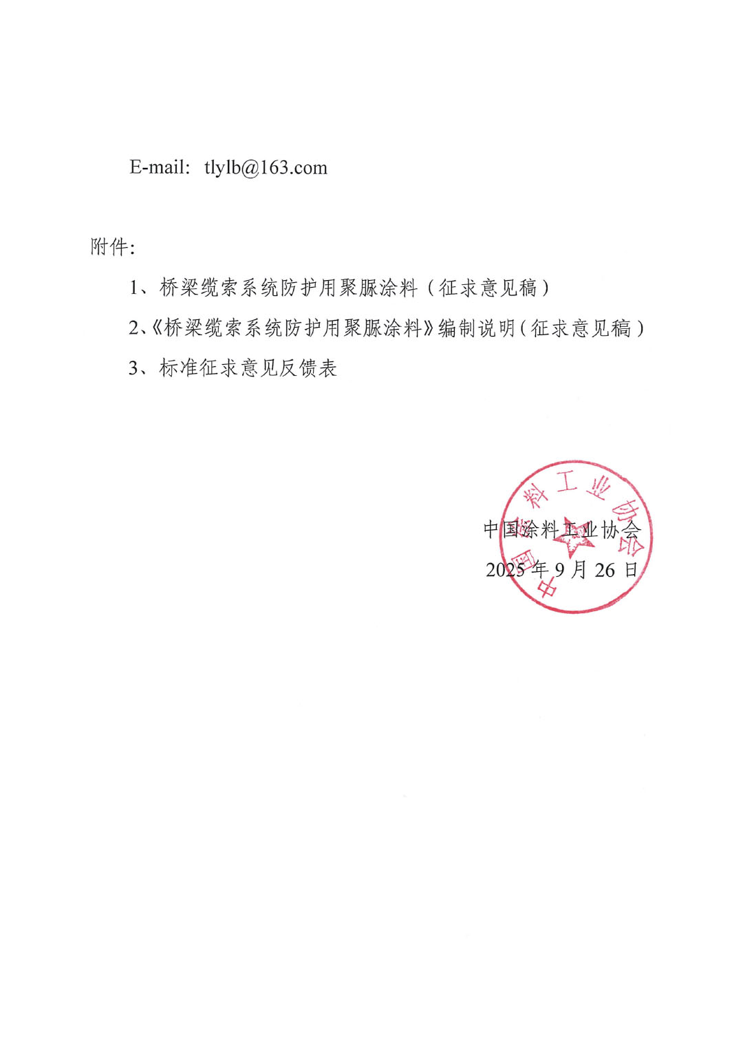 目前《桥梁缆索系统防护用聚脲涂料》已完成标准征求意见稿的编制,现公开征求意见(征求意见稿及编制说明详见附件1~2)。请贵单位认真研究,提出书面意见,并于2025年10月26日前将标准意见反馈表(附件3)以电子邮件的形式反馈至指定邮箱。