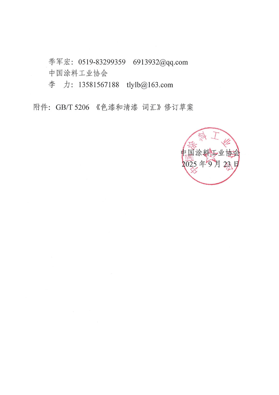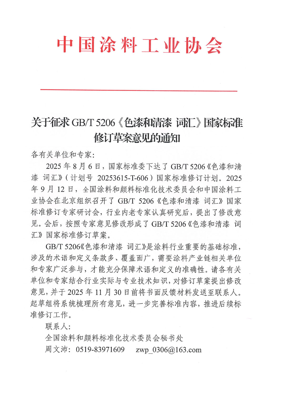 GB/T 5206《色漆和清漆 词汇》是涂料行业重要的基础标准,涉及的术语和定义条款多、覆盖面广,需要涂料产业链相关单位和专家广泛参与,才能充分保障术语和定义的准确性。请各有关单位和专家结合行业实际与专业技术知识,对修订草案提出修改意见,并于2025年11月30日前将书面反馈材料发送至联系人。起草组将系统梳理所有意见,进一步完善标准内容,推进后续标准修订工作。