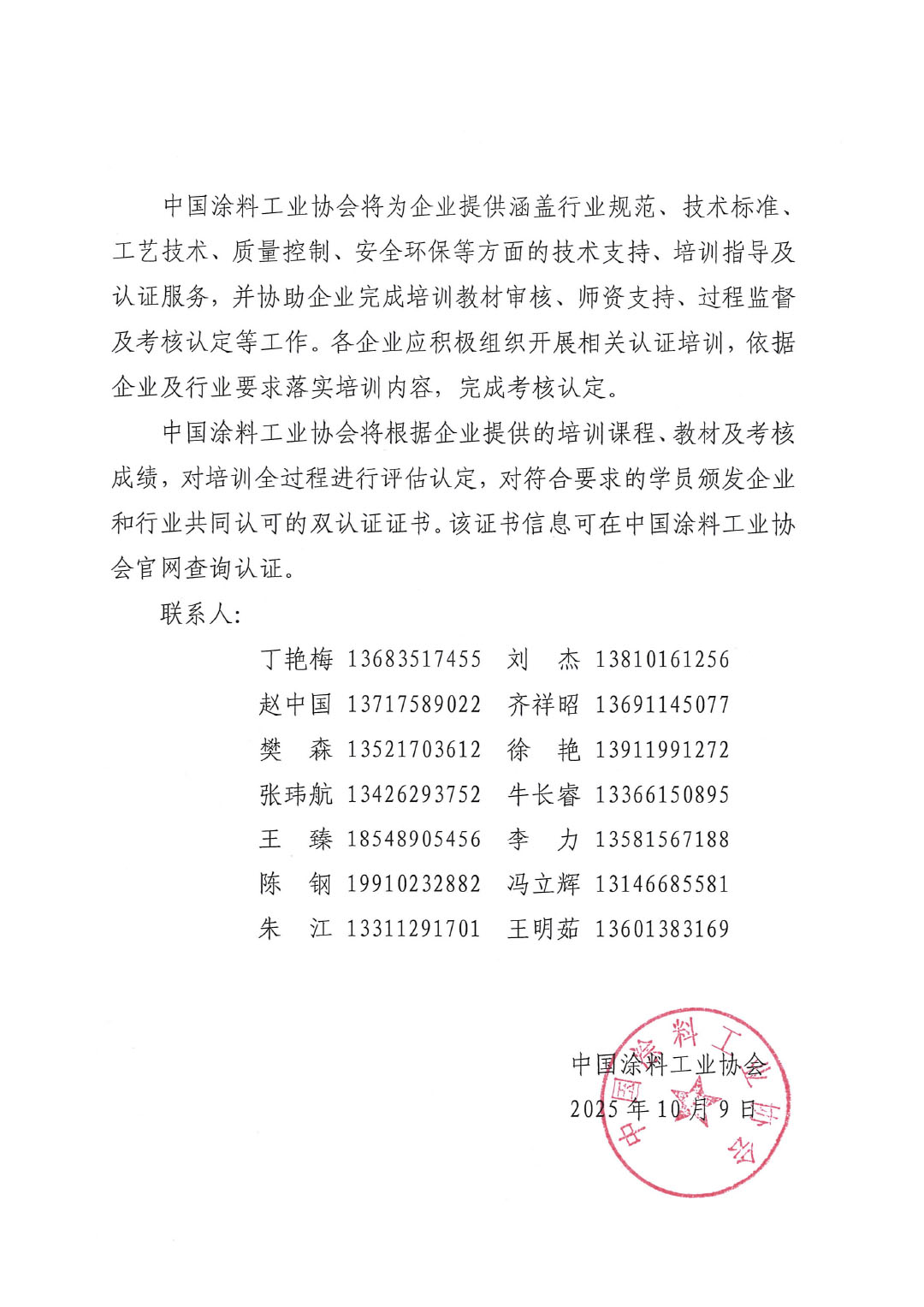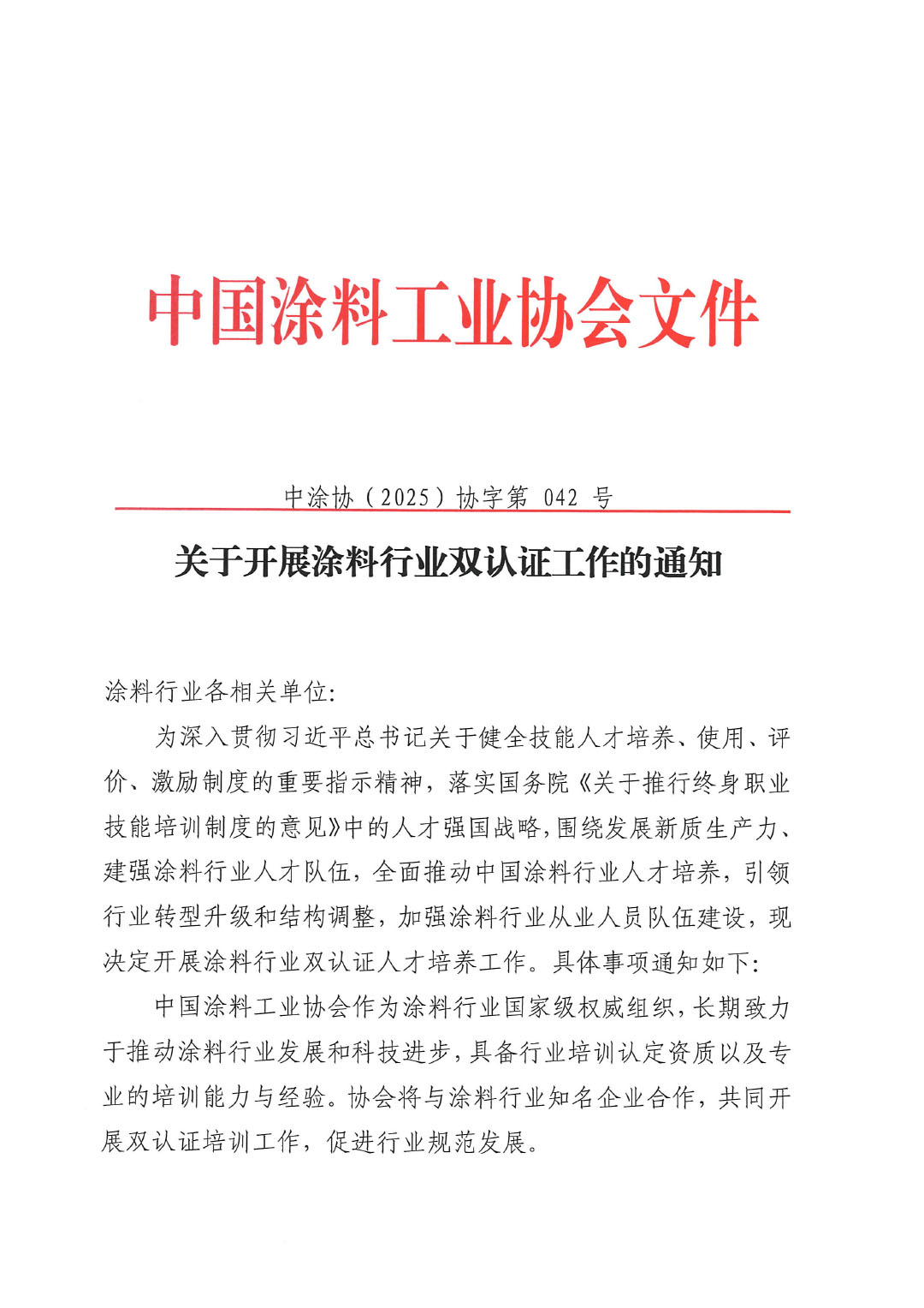 为深入贯彻习近平总书记关于健全技能人才培养、使用、评价、激励制度的重要指示精神,落实国务院《关于推行终身职业技能培训制度的意见》中的人才强国战略,围绕发展新质生产力、建强涂料行业人才队伍,全面推动中国涂料行业人才培养,引领行业转型升级和结构调整,加强涂料行业从业人员队伍建设,现决定开展涂料行业双认证人才培养工作。具体事项通知如下: