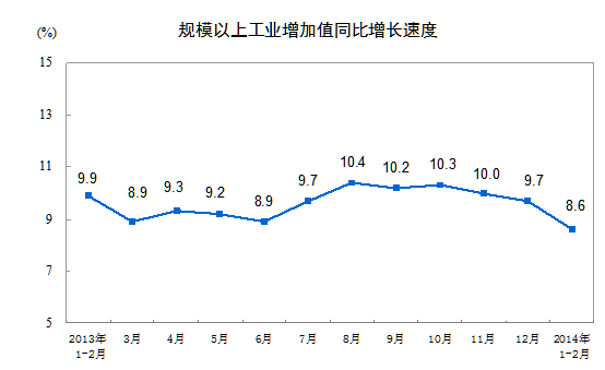 2014年1-2月份,规模以上工业增加值同比实际增长8.6 %(以下增加值增速均为扣除价格因素的实际增长率)。从环比看,2月份比上月增长0.61%。