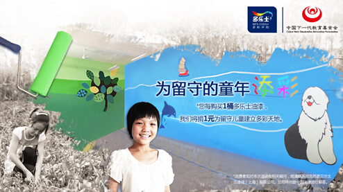 2014年,自多乐士携手中国下一代教育基金会,启动Let’s Colour多彩开始项目——留守儿童关爱计划以来, 历时83天,约500人参与涂刷,多乐士的焕新足迹遍布河北、江西、甘肃、湖南,共建立了15座多乐士多彩天地,为近万名留守儿童焕新了学习环境、打造色彩丰富的多彩天地,并为他们实现了随时与父母视频团圆的愿望,让孩子们重新绽放出灿烂的笑颜。