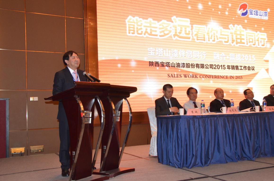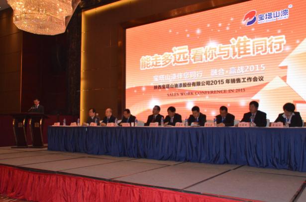 会议首先由宝塔山漆总经理助理李斌代表公司向大会做主题为“能走多远 看你与谁同行”的宝塔山漆2014年工作报告及2015年工作规划。报告中指出宝塔山漆在2014年通过不断内部自我调整和外部专业指导,努力适应新常态,在新常态中探寻适合企业发展的路径,并通过业绩、品牌、开发、结构、服务、研发、建设7个关键词梳理了宝塔山漆2014年全年的工作思路。2014年宝塔山公司共完成涂料产品销售4万余吨,比上年同期增长1千吨,实现销售额4.22亿元,上交税金3 000余万元。宝塔山漆加强推进品牌建设力度,促进企业不断发展壮大,2014年被陕西省工业和信息化厅认定为“工业品牌培育示范企业”,并大力开发利用微博、微信、电子商务平台等新的品牌宣传渠道,有力地提升了宝塔山漆在终端消费市场的知名度。此外,2014年宝塔山漆在工程工业客户的开发方面卓有成效,拓展了车辆改装、钢结构、重型机械制造、建筑内外墙等终端领域,并对经销商、代理商和加盟商进行了深掘挖潜,得到了市场的广泛认可。公司市场结构调整和产品结构调整顺应了国家经济结构调整的步伐,各大品类均有了不同程度的增长,尤其在水性涂料方面实现了跨越式增长,与上年同比增长30%,真石漆、多彩漆、刮砂漆等方面也均有突破。2014年初根据公司产品战略规划,投资200万元建设了西北地区最大的艺术涂料生产线,以满足市场需求。