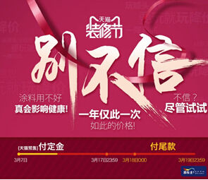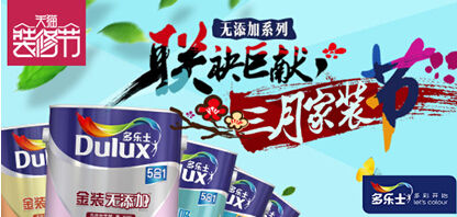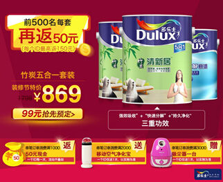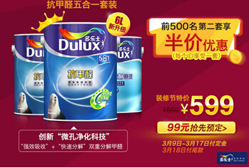 巨额优惠:抗甲醛5合1套装599元、竹炭清新居5合1套装869元、抗甲醛全效套装699元,3月9日至3月17日,抢先预付定金,只要在多乐士家装节期间支付尾款,即能享有超低给力特价!还等什么,赶紧登录多乐士天猫旗舰店http://dulux.tmall.com/抢购,跟随多乐士开启无添加超值焕新之旅吧!