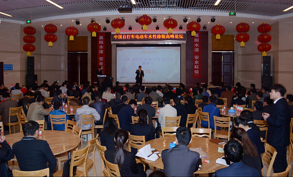 以“环保涂装 绿色出行”为主题的中国自行车、电动车水性涂装高峰论坛4月12日在晨阳水漆举行。晨阳水漆高层领导,中国自行车协会培训中心主任郑培东,全国自行车工业信息中心副主任国长军, 100余家自行车、电动车厂家领导和代表参加,共商水性涂装发展大计。