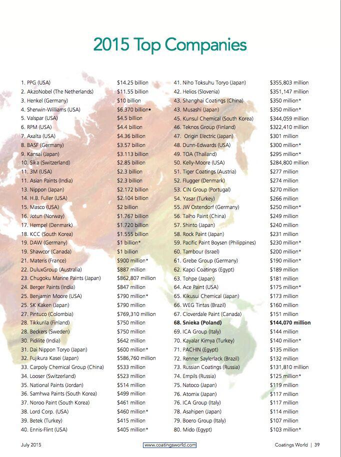 日前,由美国Coatings World杂志(July 2015)最新发布的2015年全球顶级涂料制造企业销售额排行榜(2015 Top Companies)中获悉,中国3家涂料企业入围。上榜80家公司年销售额均超过1亿美元,其中,日本16家,美国14家,德国5家,韩国4家,中国、土耳其、埃及各3家企业。波兰Snieka以1.44070亿美元的销售额首次上榜。