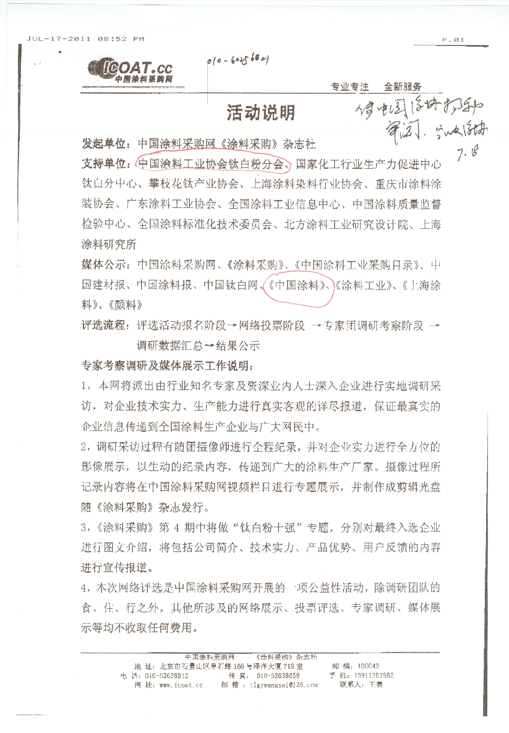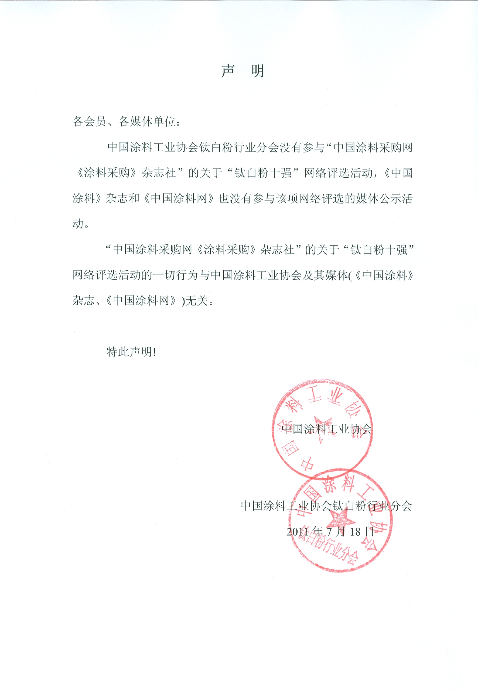关于从未参与“钛白粉十强”网络评选活动的声明
