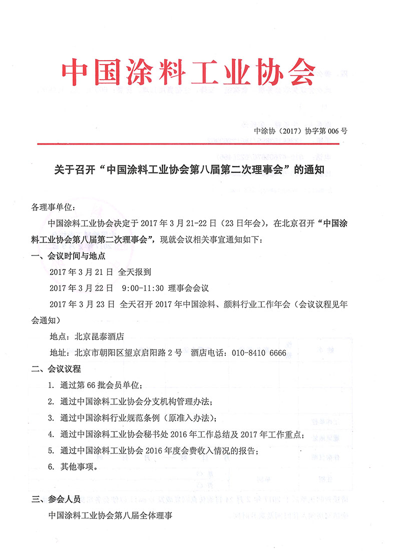 2017年3月23日 全天召开2017年中国涂料、颜料行业工作年会(会议议程见年会通知)