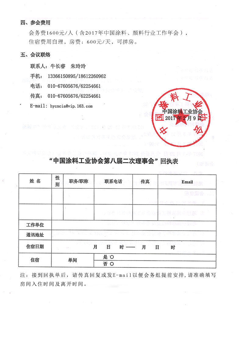 会务费1600元/人(含2017年中国涂料、颜料行业工作年会),住宿费用自理,房费:600元/天,可拼房。