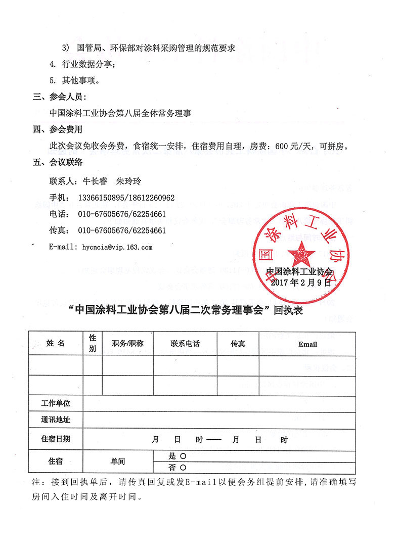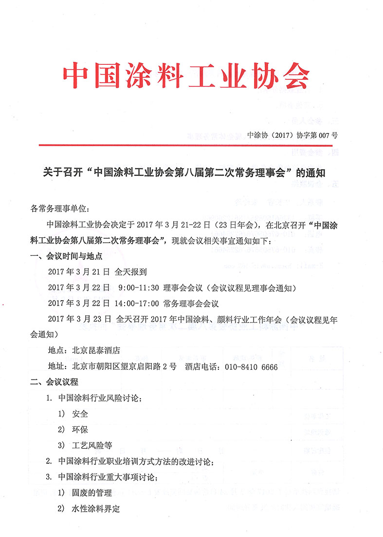 2017年3月23日 全天召开2017年中国涂料、颜料行业工作年会(会议议程见年会通知)