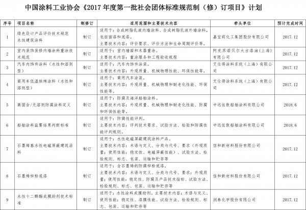 中 国涂料工业协会关于发布《2017年度第一批社会团体标准规范制(修)订项目》计划的通知