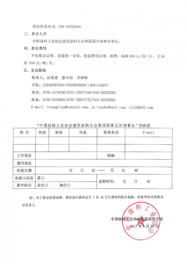 时间:7月24日下午报到,25日上午理事会,25日下午参观三棵树成都工厂。
