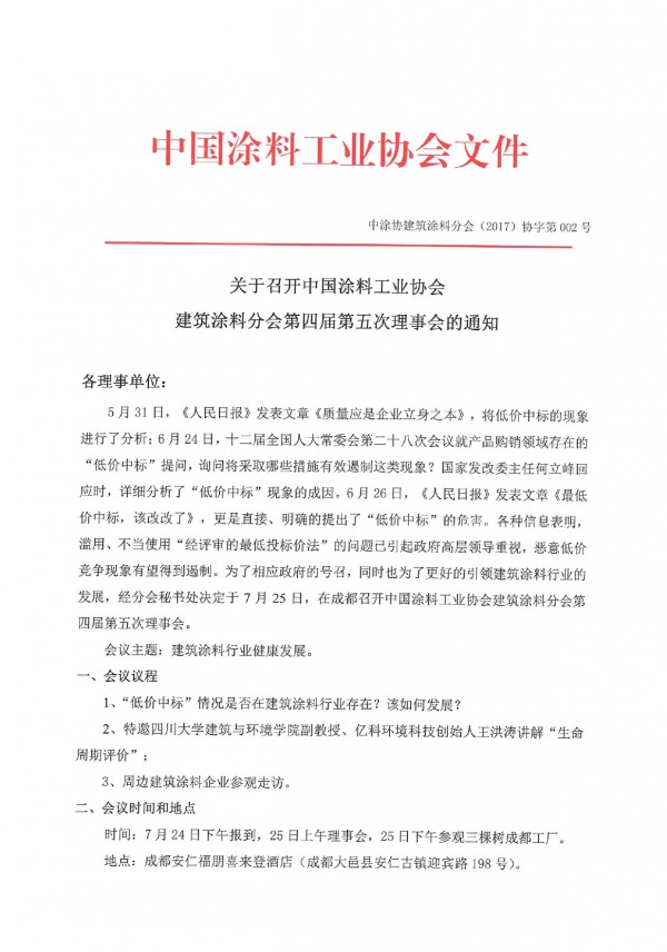 5月31日,《人民日报》发表文章《质量应是企业立身之本》,将低价中标的现象进行了分析;6月24日,十二届全国人大常委会第二十八次会议就产品购销领域存在的“低价中标”提问,询问将采取哪些措施有效遏制这类现象?国家发改委主任何立峰回应时,详细分析了“低价中标”现象的成因。6月26日,《人民日报》发表文章《最低价中标,该改改了》,更是直接、明确的提出了“低价中标”的危害。各种信息表明,滥用、不当使用“经评审的最低投标价法”的问题已引起政府高层领导重视,恶意低价竞争现象有望得到遏制。为了相应政府的号召,同时也为了更好的引领建筑涂料行业的发展,经分会秘书处决定于7月25日,在成都召开best365中国官方网站建筑涂料分会第四届第五次理事会。
