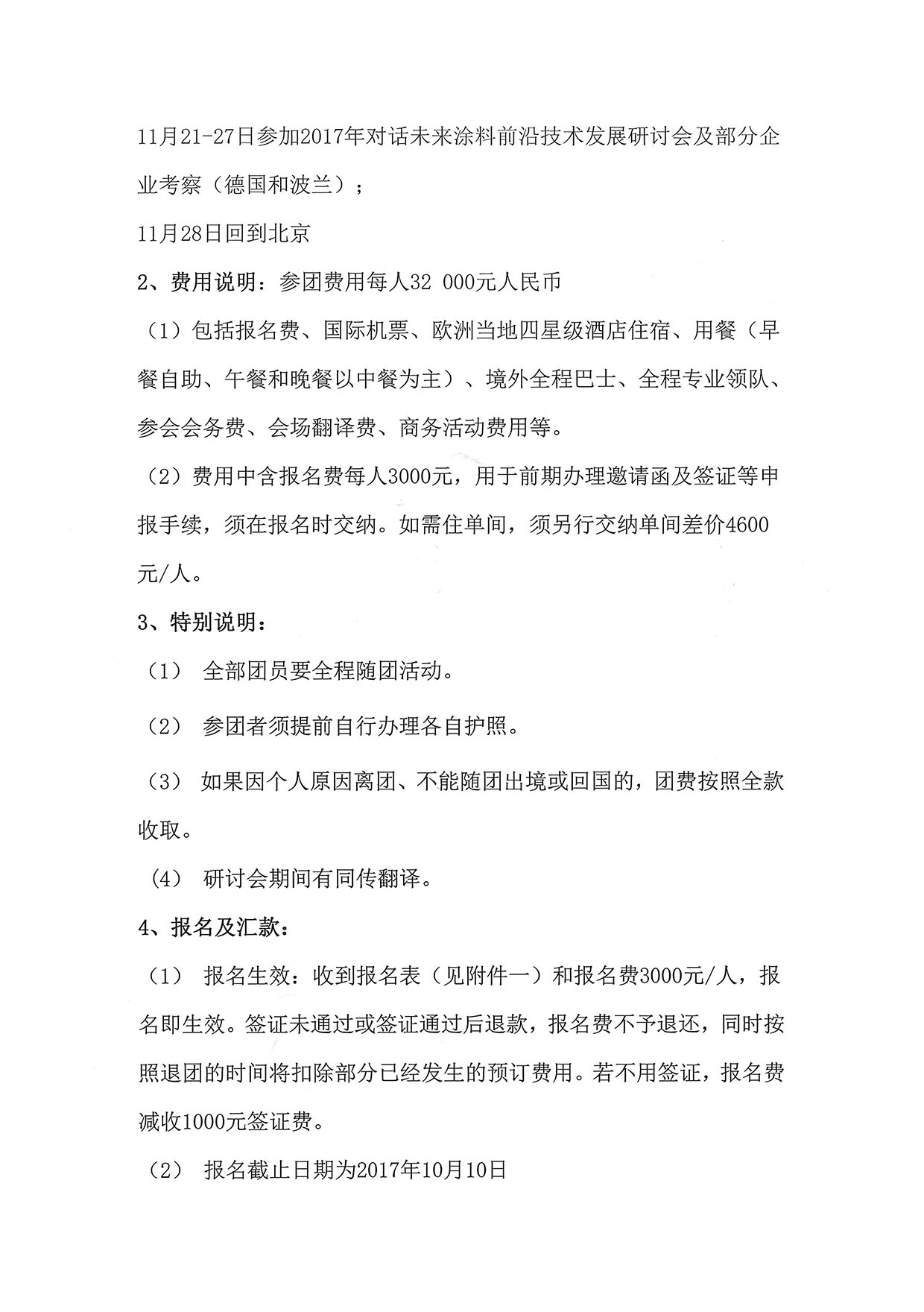 2、费用中含报名费每人3000元,用于前期办理邀请函及签证等申报手续,须在报名时交纳。如需住单间,须另行交纳单间差价4600元/人。