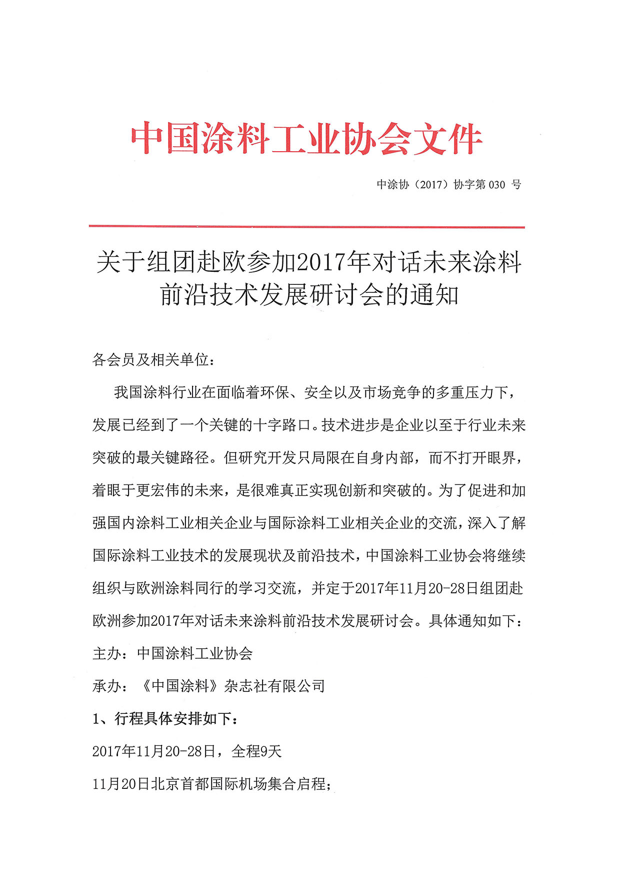 我国涂料行业在面临着环保、安全以及市场竞争的多重压力下,发展已经到了一个关键的十字路口。技术进步是企业以至于行业未来突破的最关键路径。但研究开发只局限在自身内部,而不打开眼界,着眼于更宏伟的未来,是很难真正实现创新和突破的。为了促进和加强国内涂料工业相关企业与国际涂料工业相关企业的交流,深入了解国际涂料工业技术的发展现状及前沿技术,best365中国官方网站将继续组织与欧洲涂料同行的学习交流,并定于2017年11月20-28日组团赴欧洲参加2017年对话未来涂料前沿技术发展研讨会。具体通知如下: