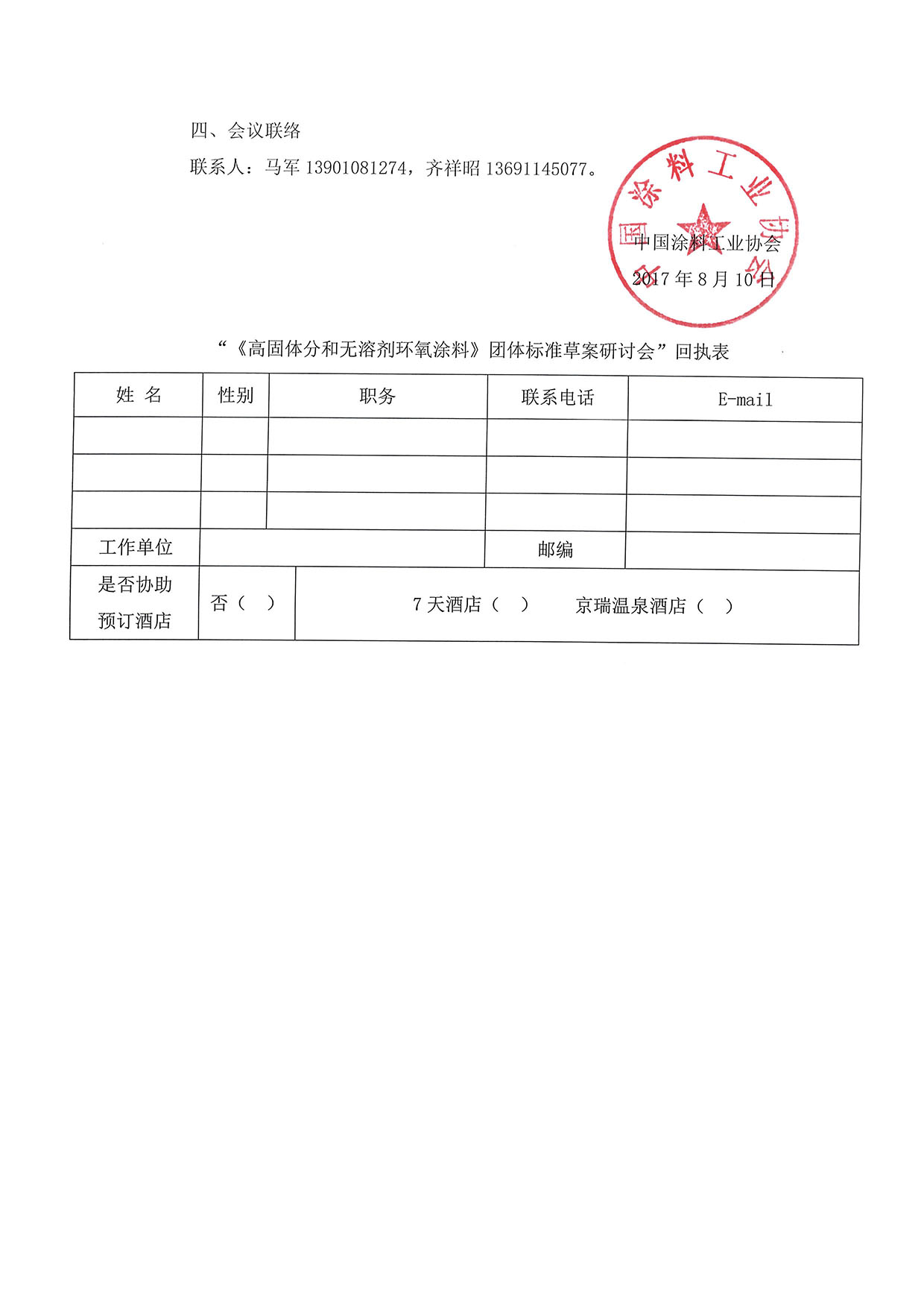 “《高固体分和无溶剂环氧涂料》团体标准草案研讨会”回执表