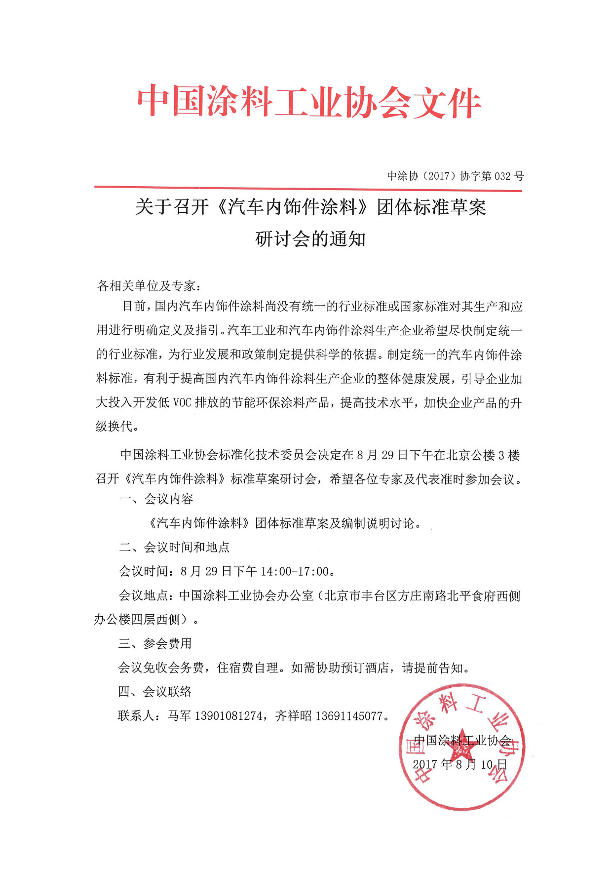 best365中国官方网站标准化技术委员会决定在8月29日下午在北京召开《汽车内饰件涂料》标准草案研讨会,希望各位专家及代表准时参加会议。