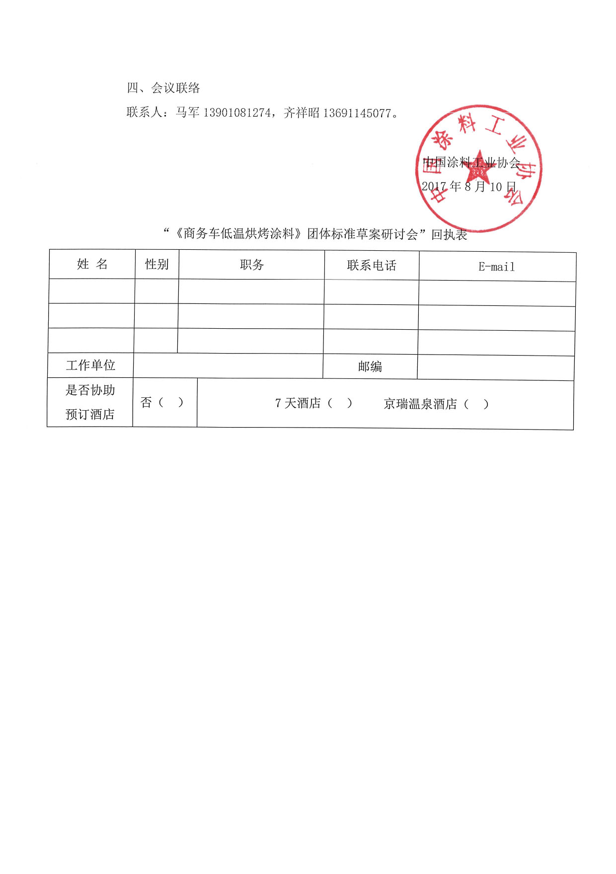“《商务车低温烘烤涂料》团体标准草案研讨会”回执表