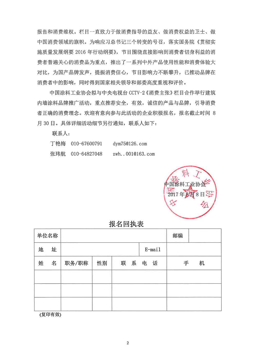 best365中国官方网站拟与中央电视台CCTV-2《消费主张》栏目合作举行建筑内墙涂料品牌推广活动,重点推荐安全,有效,诚信的产品与品牌,引导消费者正确的消费理念。欢迎有意向参与此活动的企业积极报名,报名截止时间8月30日。具体详细活动细节另行通知,联系人如下: