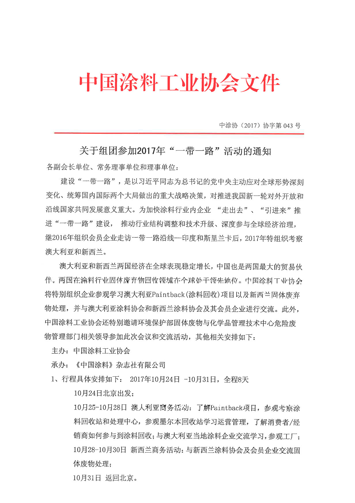 建设“一带一路”,是以习近平同志为总书记的党中央主动应对全球形势深刻变化、统筹国内国际两个大局做出的重大战略决策,对推进我国新一轮对外开放和沿线国家共同发展意义重大。为加快涂料行业内企业“走出去”、“引进来”推进“一带一路”建设,推动行业结构调整和技术升级、深度参与全球经济治理,继2016年组织会员企业走访一带一路沿线—印度和斯里兰卡后,2017年特组织考察澳大利亚和新西兰。