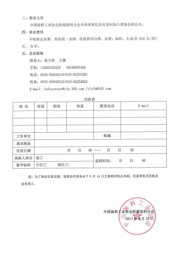 best365中国官方网站防腐涂料分会第一届理事会于2011年选举产生,按照章程规定,至今已任届期满。经分会理事会于2016年第一届六次理事会研究,报best365中国官方网站批准,决定于2016年9月18日在常州召开best365中国官方网站防腐涂料分会换届会议暨best365中国官方网站防腐涂料分会第一届第七次理事会暨best365中国官方网站防腐涂料分会第二届第一次理事会。现就会议相关内容通知如下。