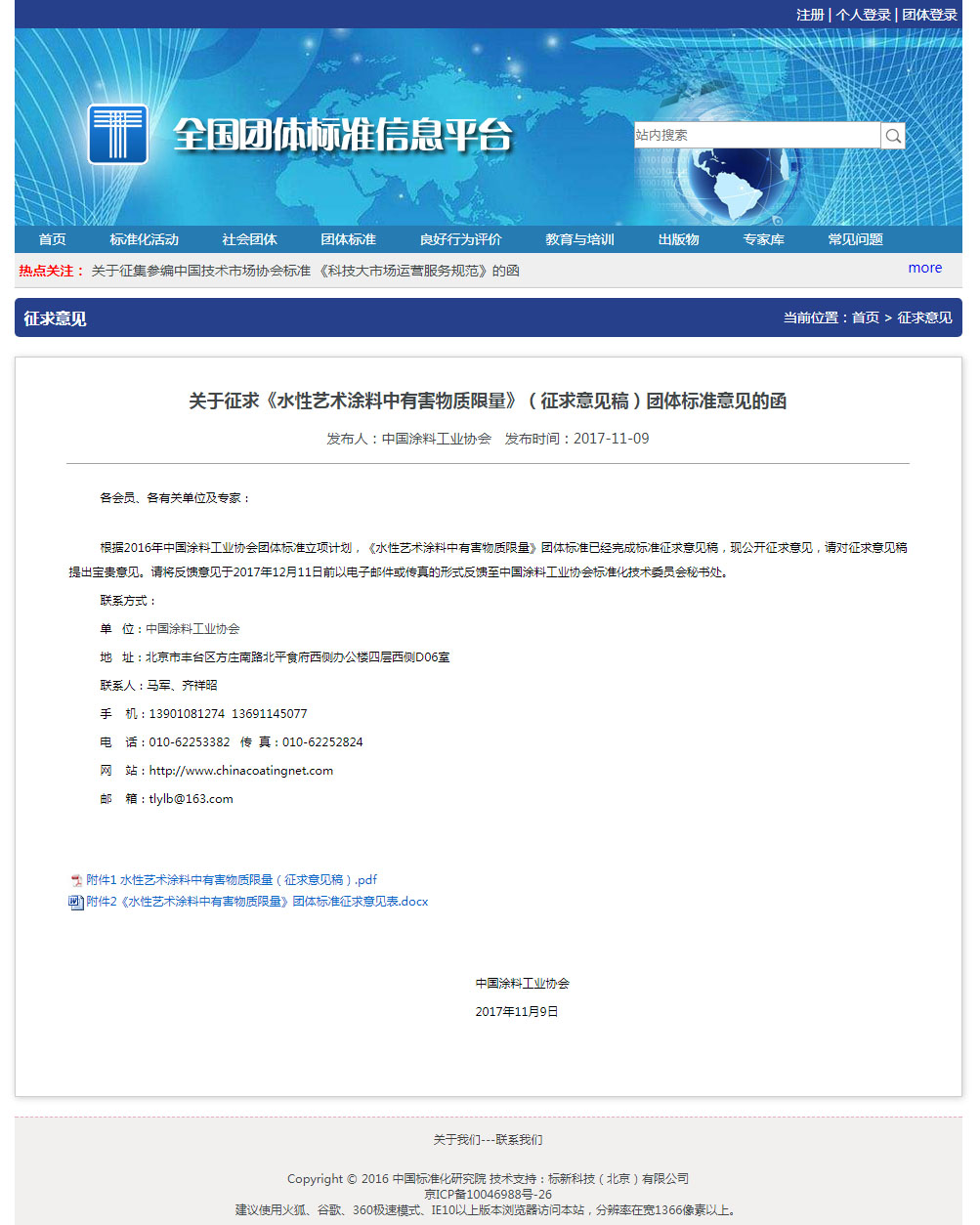 根据2016年best365中国官方网站团体标准立项计划,《水性艺术涂料中有害物质限量》团体标准已经完成标准征求意见稿,现公开征求意见,请对征求意见稿提出宝贵意见。请将反馈意见于2017年12月11日前以电子邮件或传真的形式反馈至best365中国官方网站标准化技术委员会秘书处。