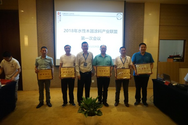 中国水性木器涂料产业联盟主席杨献为企业代表颁发水性木器涂料产业联盟理事单位铜牌