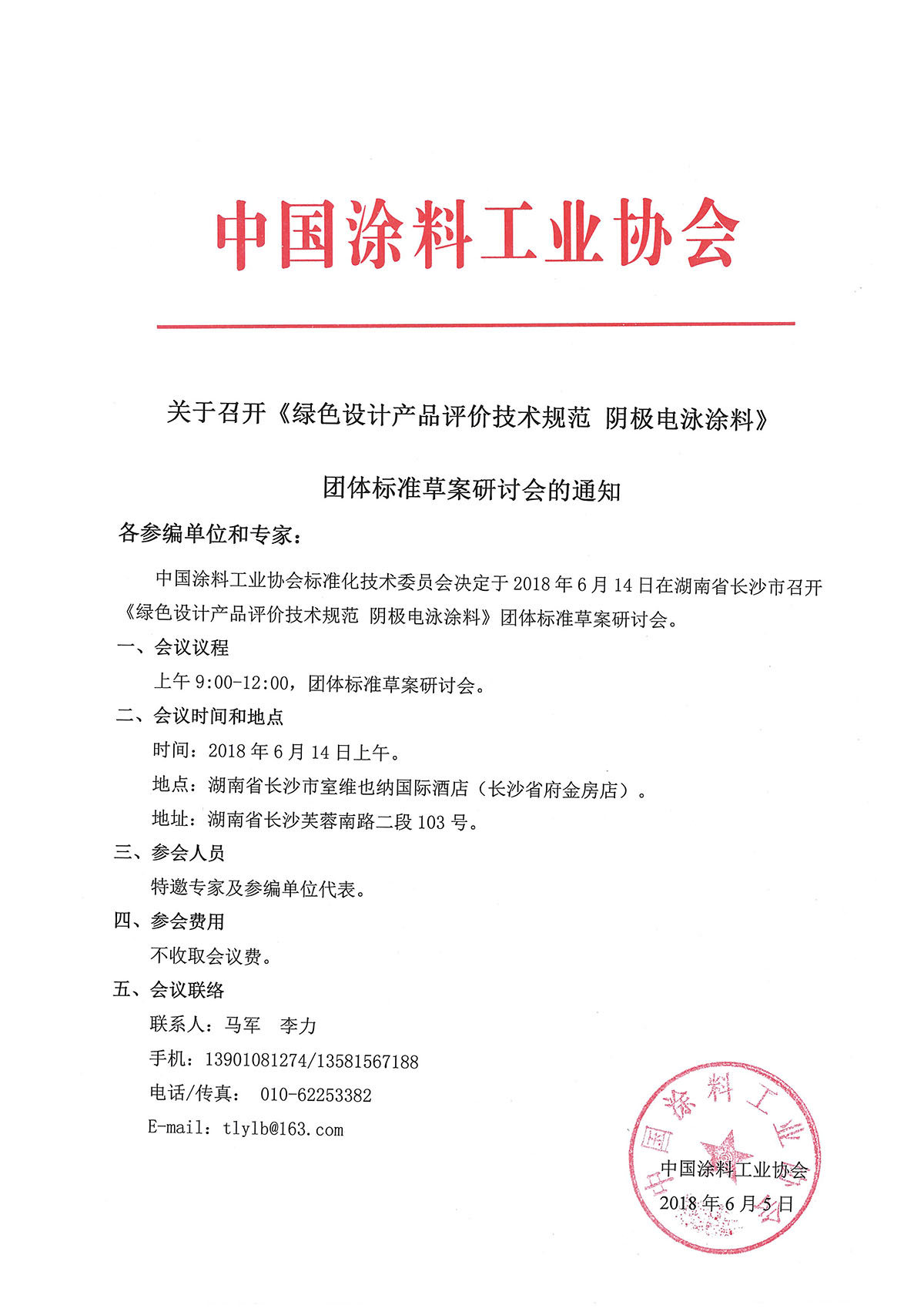 PDF 关于召开《绿色设计产品评价技术规范 阴极电泳涂料》团体标准草案研讨会会的通知 |