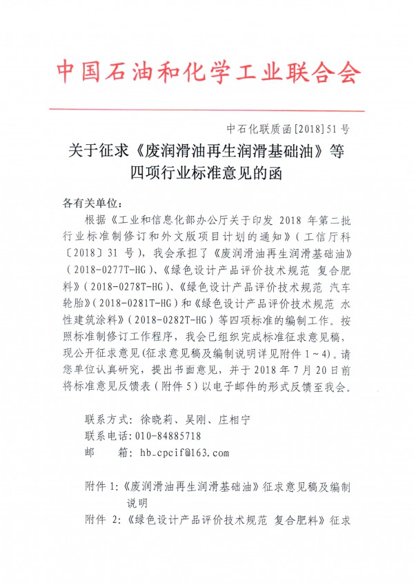 关于征求《废润滑油再生润滑基础油》等四项行业标准意见的函 |