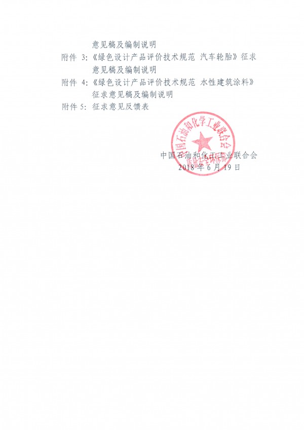 按照中国石油和化学工业联合会要求,《绿色设计产品评价技术规范 水性建筑涂料》行业标准现开始征求意见,各单位请将意见反馈表(附件:4)发送至邮箱tlylb@163.com,联系人:李力 13581567188 / 010-62252824。