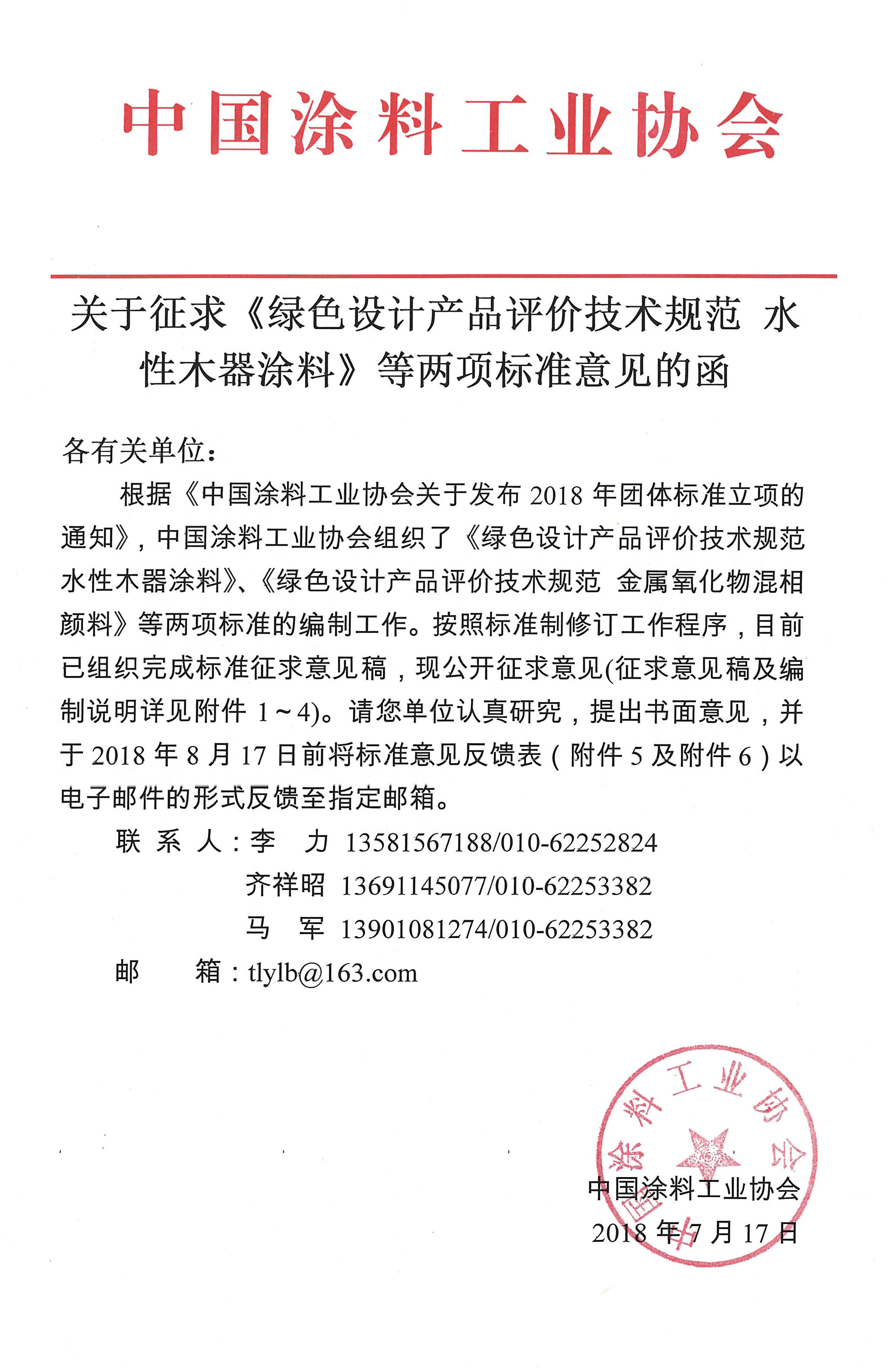 根据《best365中国官方网站关于发布2018年团体标准立项的通知》,best365中国官方网站组织了《绿色设计产品评价技术规范水性木器涂料》、《绿色设计产品评价技术规范金属氧化物混相颜料》等两项标准的编制工作。按照标准制修订工作程序,目前已组织完成标准征求意见稿,现公开征求意见(征求意见稿及编制说明详见附件1~4)。请您单位认真研究,提出书面意见,并于2018年8月17日前将标准意见反馈表(附件5及附件6)以电子邮件的形式反馈至指定邮箱。