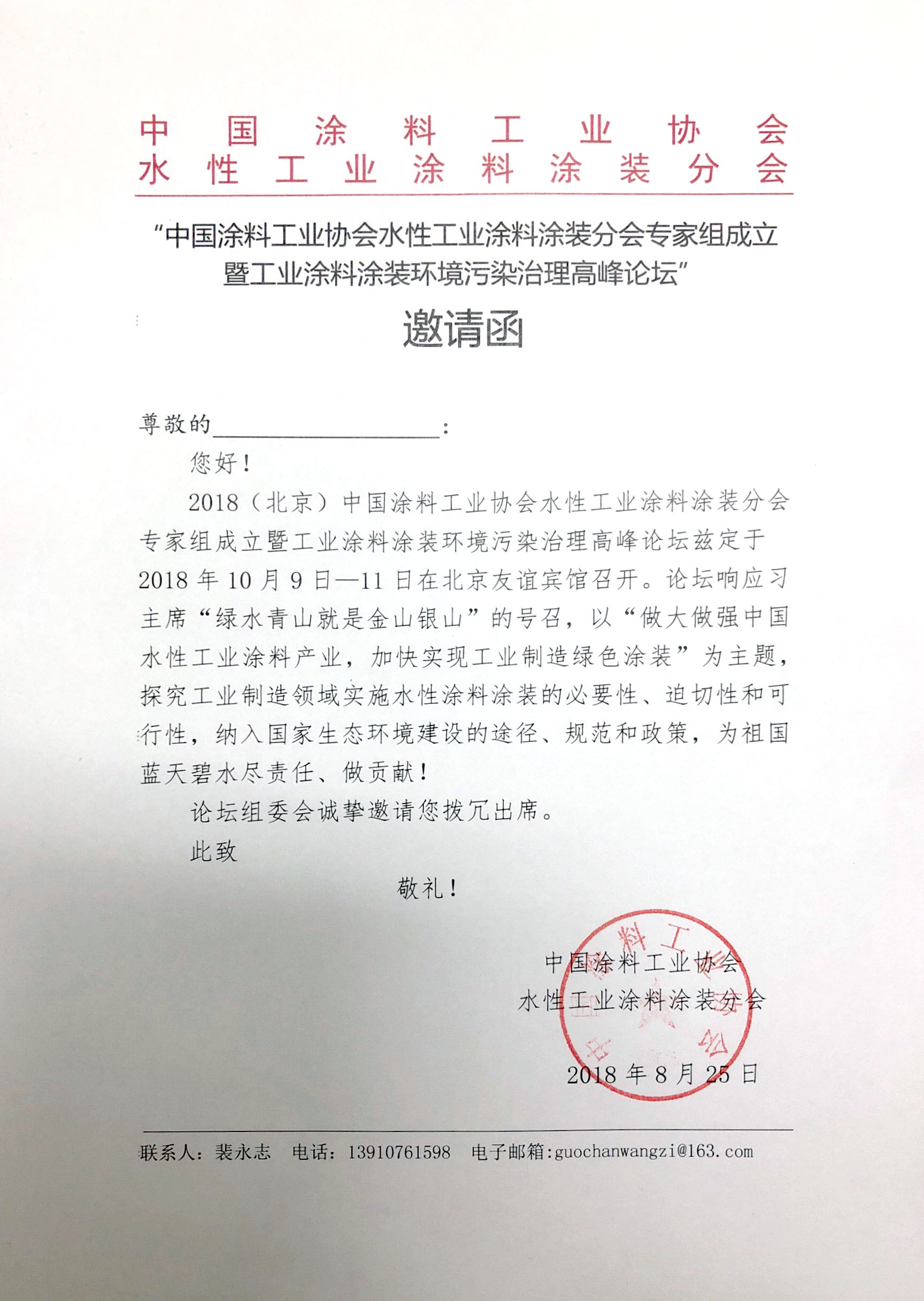 2018(北京)best365中国官方网站水性工业涂料涂装分会专家组成立暨工业涂料涂装环境污染治理高峰论坛兹定于2018年10月9日—11日在北京友谊宾馆召开。论坛响应习主席“绿水青山就是金山银山”的号召,以“做大做强中国水性工业涂料产业,加快实现工业制造绿色涂装”为主题,探究工业制造领域实施水性涂料涂装的必要性、迫切性和可行性,纳入国家生态环境建设的途径、规范和政策,为祖国蓝天碧水尽责任、做贡献!