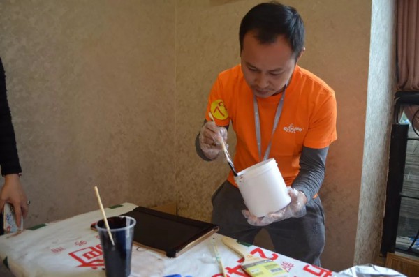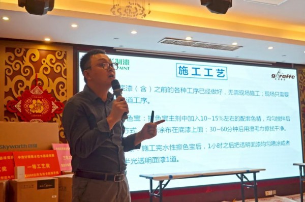 技术服务部卢国强先生上台为大家介绍了竞赛规则、中华制漆水性系列产品、水性产品性能、施工操作及相关注意事项,并与现场的油漆工师傅进行交流,实现自我增值与分享。