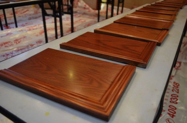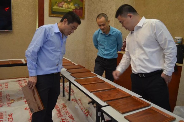 80块成品整齐摆放,评委们针对不同角度的呈现效果,层层筛选,根据成品的颜色效果、漆膜效果、样板整洁度进行评比。