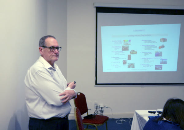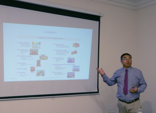 阿根廷作为南美第三大涂料市场,在南美地区也占有举足轻重的位置。会中,拥有30年以上涂料行业背景的丹尼尔先生与考察团团员详细分享了2017年阿根廷涂料发展情况以及11大涂料细分领域的生产、市场份额以及涂料品种使用情况,使团员对阿根廷涂料市场有了更进一步的了解,也为今后的进一步合作奠定了基础。据丹尼尔先生介绍,2017年阿根廷涂料市场产量达2.51亿升,销售额达9亿美元。细分领域中,建筑涂料占比最大,产量和销售额分别达到1.87亿升和4.64亿美元,占比分别高达74.5%和51.6%;产量统计中,一般工业涂料占比4.8%、汽车OEM涂料占比4.4%、汽车修补涂料占比4.4%、工业养护和维护涂料占比3.2%、木器涂料占比2.4%、粉末涂料占比2.4%、包装涂料占比1.6%、卷材涂料占比1.6%、船舶涂料占比0.4%。随后,丹尼尔先生就以上细分领域从产量、销售额、涂料公司、集中度、市场占有率、产品类型等方面进行了详细的讲解,使团员从多方位深入了解了不同细分市场的发展状况,并结合自身企业情况寻求合作机会。
