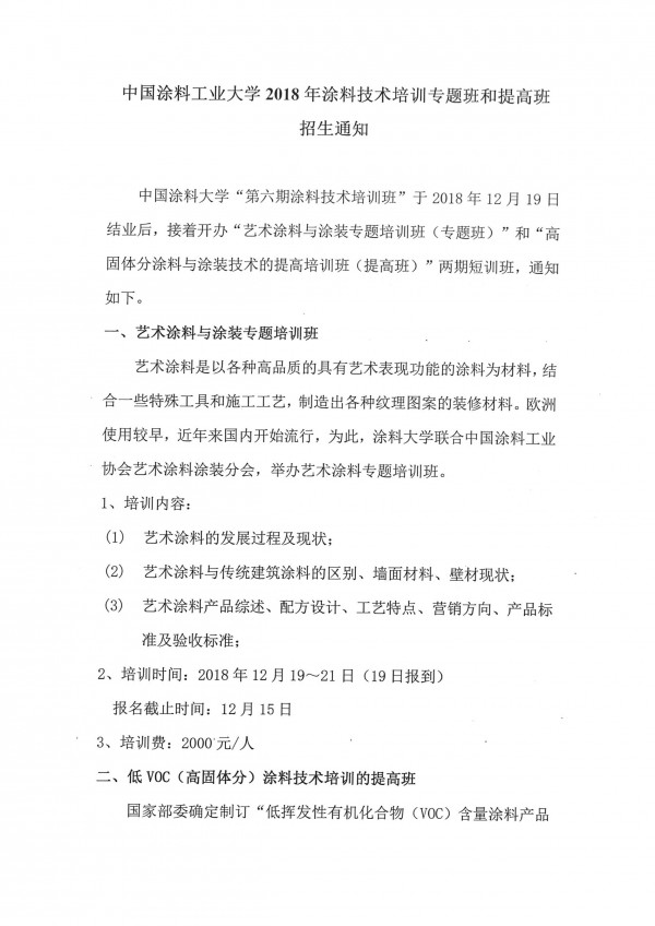 中国涂料工业大学“第六期涂料技术培训班”于2018年12月19日结业后,接着开办“艺术涂料与涂装专题培训班(专题班)”和“高固体分涂料与涂装技术的提高培训班(提高班)”两期短训班,通知如下。